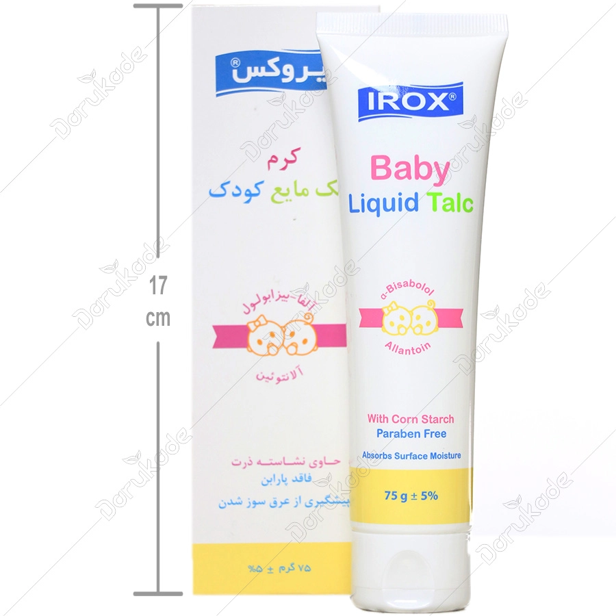 کرم تالک مایع کودک ایروکس با فرمولاسیون ویژه پس از استفاده بلافاصله تبدیل به پودر تالک می شود و عوارض جانبی ناشی از استنشاق پودر های تالک معمول را ندارد. این محصول با جذب رطوبت سطح پوست و ایجاد حالت ابریشمی از اصطکاک پوست در نواحی چین دار بدن جلوگیری می کند و مانع از عرق سوز شدن این نواحی می شود.