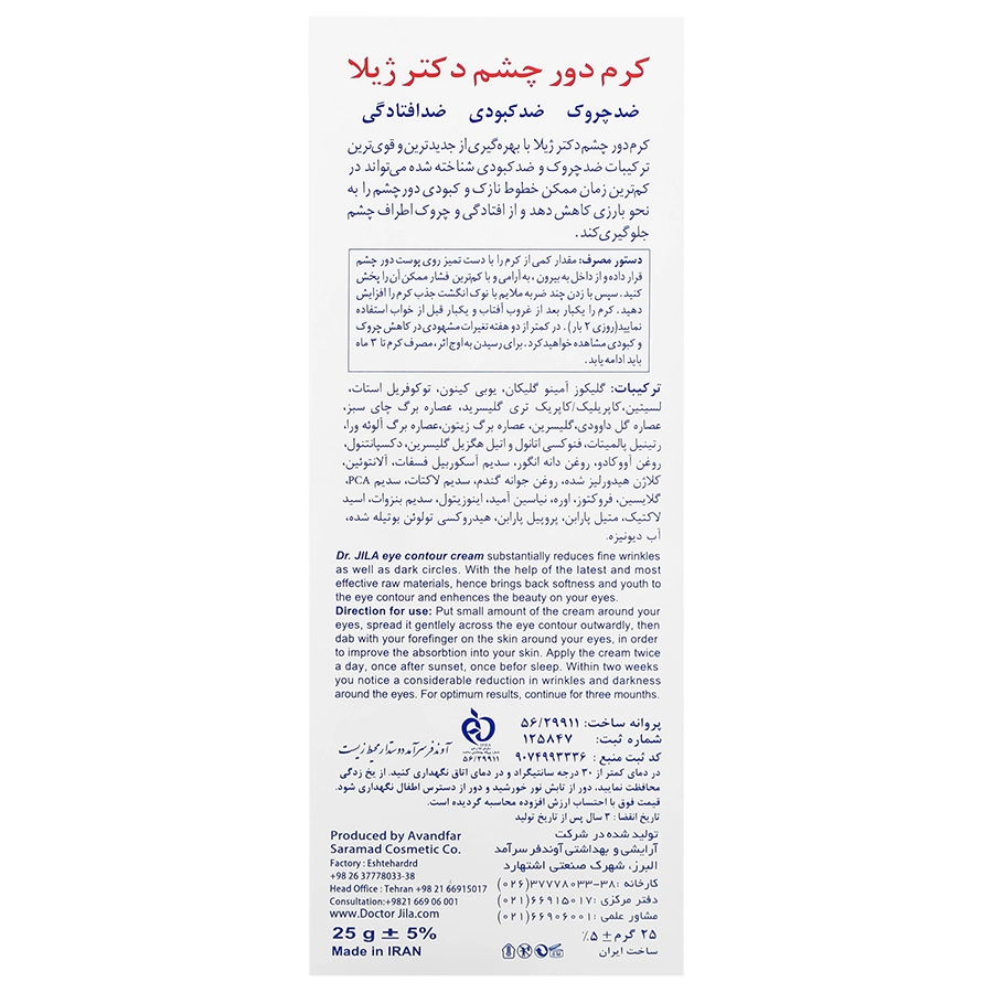 کرم دور چشم دکتر ژیلا حاوی ترکیبات ضد چروک (Anti-Aging)، روشن کننده و ضد کبودی دور چشم، مرطوب کننده و نرم کننده است. ترکیبات ضد چروک از لحاظ ساختاری گلیکوز آمینو گلیکان بوده و آنزیم کلاژناز را مهار می کنند و از این طریق مانع از تخریب کلاژن می شوند. ترکیبات آنتی اکسیدان محصول شامل ویتامین E و C پـایـدار، Q10، عصاره گیاهان برگ زیتون، چای سبز و کریزانتلیس، به خوبی سبب مهار رادیکال های آزاد شده و موجب کاهش چین و چروک، کاهش اثر تخریب های اکسیداتیو پرتو UV و بنابراین مقابله با Photoaging می گردند.
