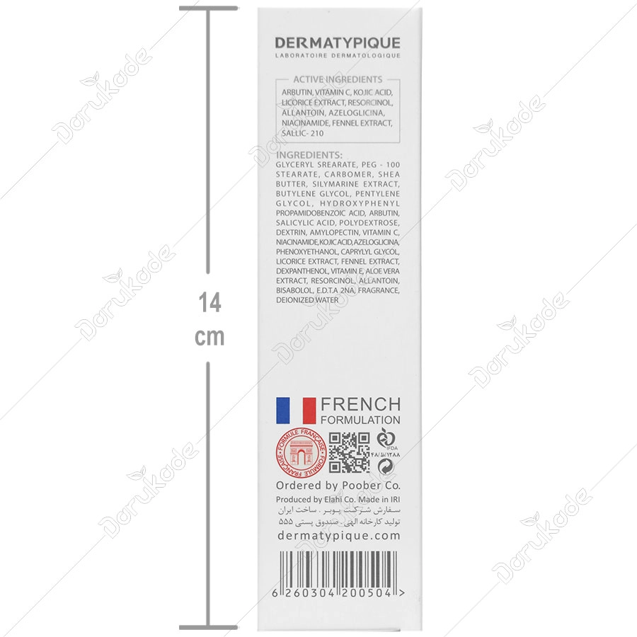 کرم روشن کننده درماتیپیک با کمک ترکیبی از 10 عامل ضد لک موثر، این کرم روشن کننده قوی از طریق مکانیسم های عمل متنوع بر تمام مراحل ساخت ملانین اثر می گذارد. این کرم سبب کاهش قابل رؤیت انواع لک ناشی از نور خورشید، بارداری، پیری، اقدامات درمانی و غیره می شود. این محصول به درمان ملاسما، کک و مک، لنتیگو و سایر انواع هایپرپیگمانتاسیون کمک می کند.