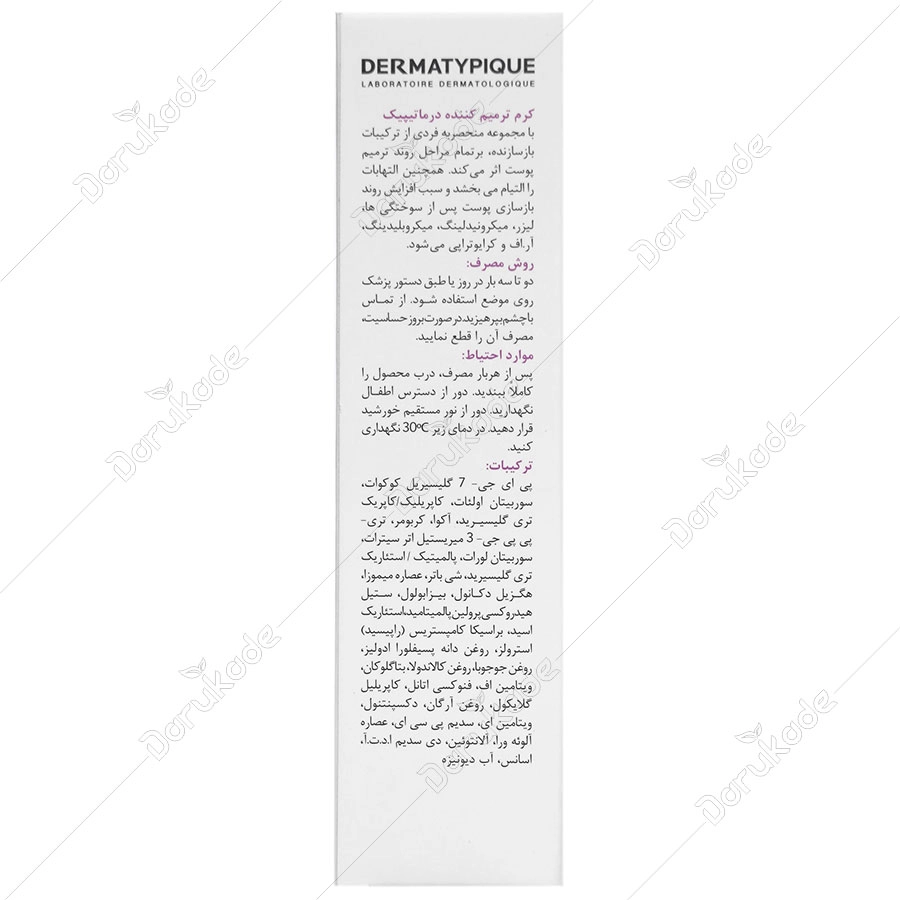 کرم ترمیم کننده درماتیپیک با مجموعه منحصر به فردی از ترکیبات بازسازنده، بر تمام مراحل روند ترمیم پوست اثر می کند. همچنین التهابات را التیام می بخشد و سبب افزایش روند بازسازی پوست پس از سوختگی ها، لیزر، میکرونیدلینگ، میکروبلیدینگ، آر.اف و کرایوتراپی می شود.