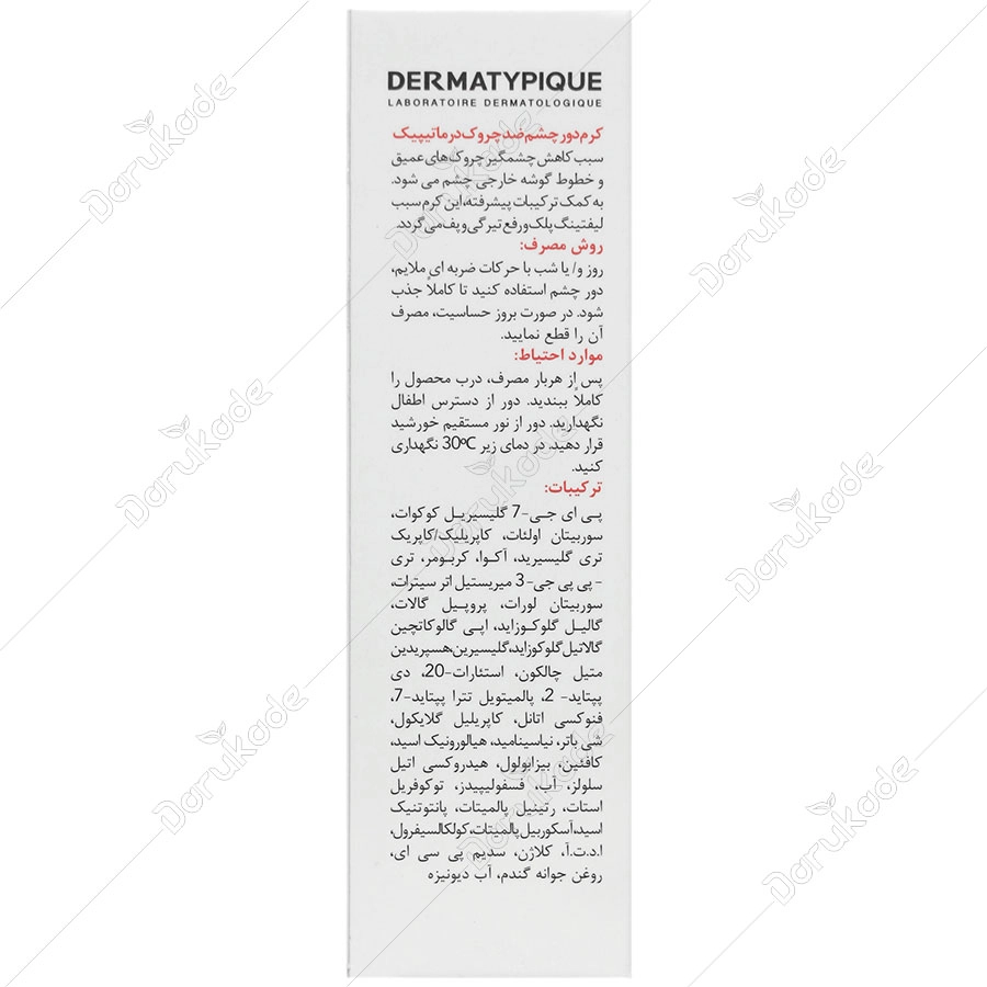 کرم دور چشم ضد چروک درماتیپیک سبب کاهش چشمگیر چروک های عمیق و خطوط گوشه خارجی چشم می شود. به کمک ترکیبات پیشرفته، این کرم سبب لیفتینگ پلک و رفع تیرگی و پف می گردد.