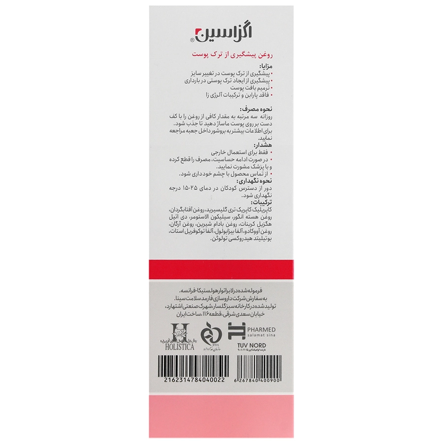 از هر ده زن باردار، 9 نفر در مقطعی از بارداری خود دچار ترک های پوستی می شوند و جدای از شکم، ران ها، سینه ها و باسن ممکن است علائم کشش را نشان دهند. دلیل این امر تغییرات هورمونی و اثرگذاری این تغییرات بر فیبرهای کلاژن و الاستین است و باعث کشش زیاد و پارگی این رشته های پروتئینی می شود. در روغن ضد ترک بارداری اگزاسین از ترکیبات رطوبت رسان خاص مانند روغن آووکادو، روغن بادام و روغن آرگان استفاده شده است که می توانند تا حدود زیادی از ترک خوردن پوست جلوگیری کنند.