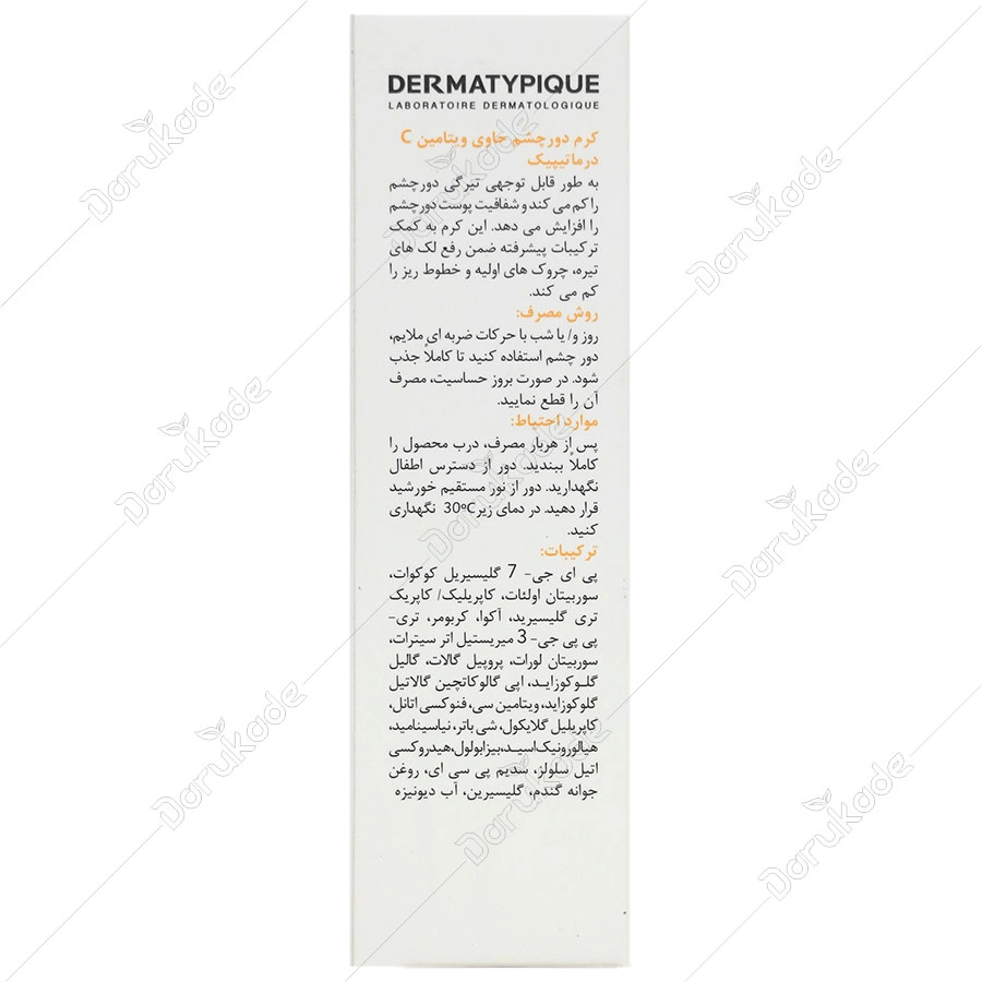 کرم دور چشم ویتامین سی درماتیپیک به طور قابل توجهی تیرگی دور چشم را کم می کند و شفافیت پوست دور چشم را افزایش می دهد. این کرم به کمک ترکیبات پیشرفته ضمن رفع لک های تیره، چروک های اولیه و خطوط ریز را کم می کند.