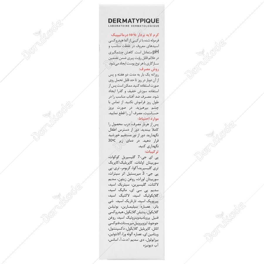 کرم لایه بردار 10% درماتیپیک فرموله شده با ترکیبی از آلفا هیدروکسی اسیدهای معروف در غلظت مناسب و PH متعادل است. کاهش چشمگیری در علائم قابل رؤیت پیری ضمن تضمین سازگاری با هر نوع پوست ایجاد می شود.