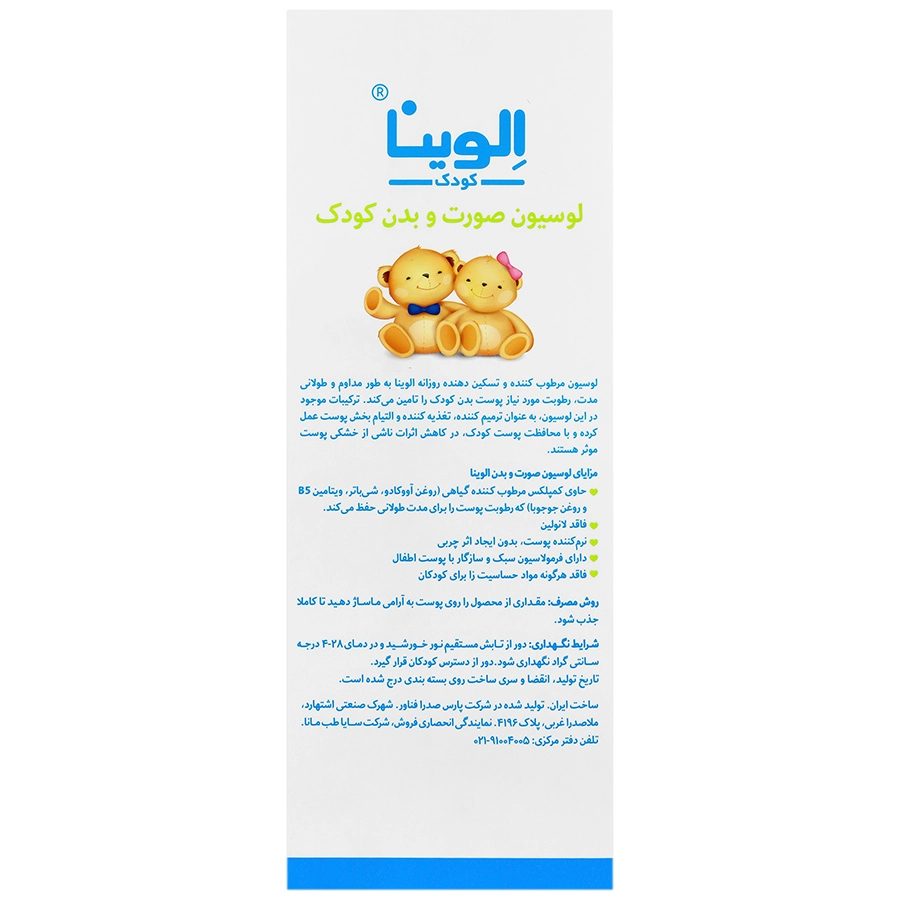 لوسیون مرطوب کننده و تسکین دهنده روزانه الوینا به طور مداوم و طولانی مدت، رطوبت مورد نیاز پوست بدن کودک را تامین می کند. ترکیبات موجود در این لوسیون، به عنوان ترمیم کننده، تغذیه کننده و التیام بخش پوست عمل کرده و با محافظت پوست کودک، در کاهش اثرات ناشی از خشکی پوست موثر هستند.