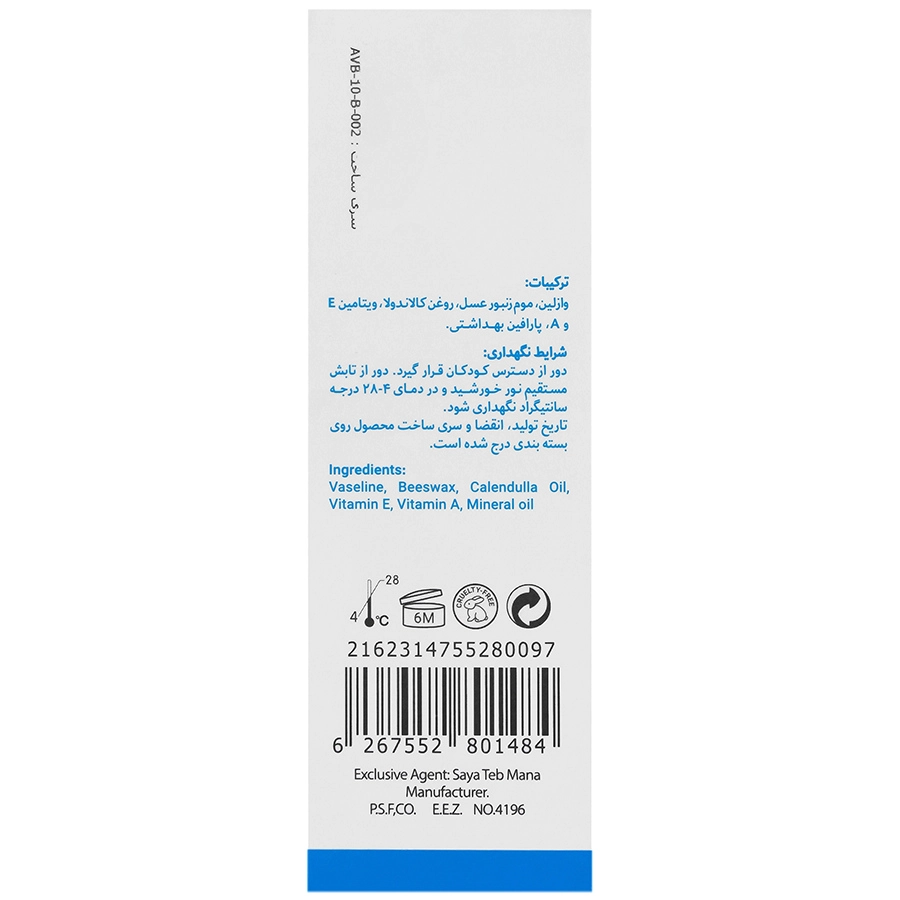 ترکیبات: وازلین، موم زنبور عسل، روغن کالاندولا، ویتامین E و A، پارافین بهداشتی