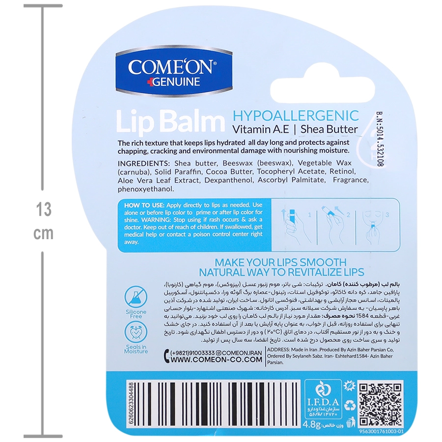 مقدار مورد نیاز از بالم لب کامان را روی لب خود بزنید. میتوانید به تنهایی برای استفاده روزانه، قبل از خواب، به عنوان پایه آرایش یا بعد از آن استفاده کنید.