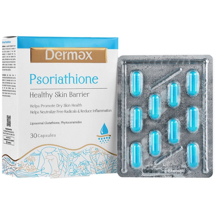 مکمل درمکس سوریاتیون ترکیب منحصر به فردی از دو ماده گلوتاتیون لیپوزومال و سراموزید می باشد که به تحریک سنتز سرامید در پوست کمک کرده و سبب حفظ رطوبت و سلامت سد دفاعی پوست می گردد. این مکمل همچنین از طریق کمک به هیدراته نمودن پوست و خواص ضد التهابی، سبب کمک به کاهش علائم پسوریازیس از قبیل التهاب، خارش و پوسته ریزی می گردد.