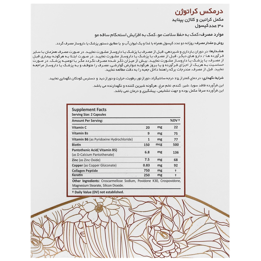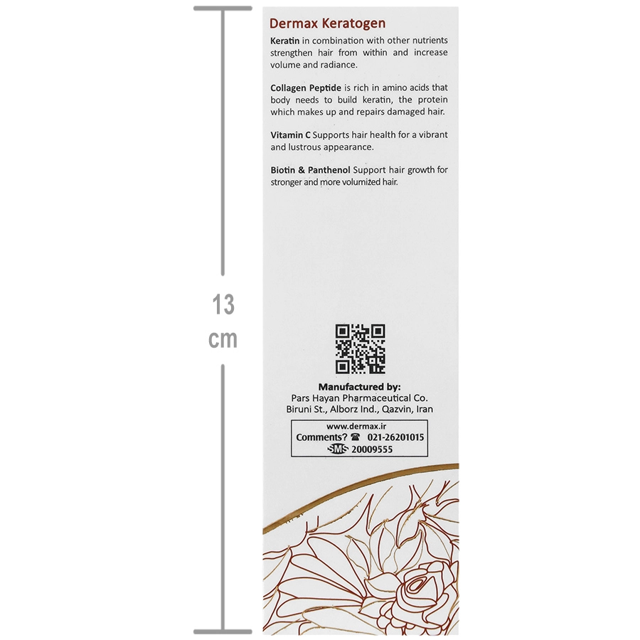 مکمل درمکس کراتوژن با دارا بودن کراتین و و کلاژن پپتاید سبب کمک به تقویت و استحکام ساقه مو می گردد. مواد مغذی موجود در این مکمل سبب درخشندگی و ضخامت تار مو و همچنین رشد مو می گردند.