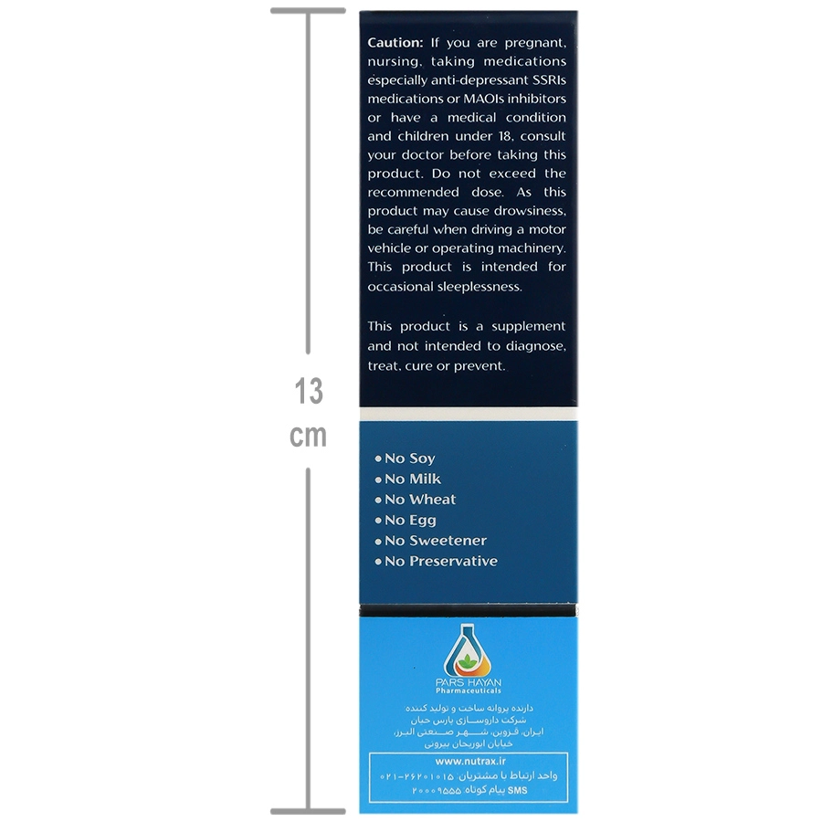 هر کپسول حاوی 75 میلی گرم عصاره ریشه سنبل الطیب، 50 میلی گرم گابا، 50 میلی گرم تریپتوفان، 50 میلی گرم عصاره بابونه، 50 میلی گرم عصاره گل ساعتی، 50 میلی گرم عصاره Lemon Balm، 50 میلی گرم عصاره رازک و 1 میلی گرم ملاتونین می باشد.