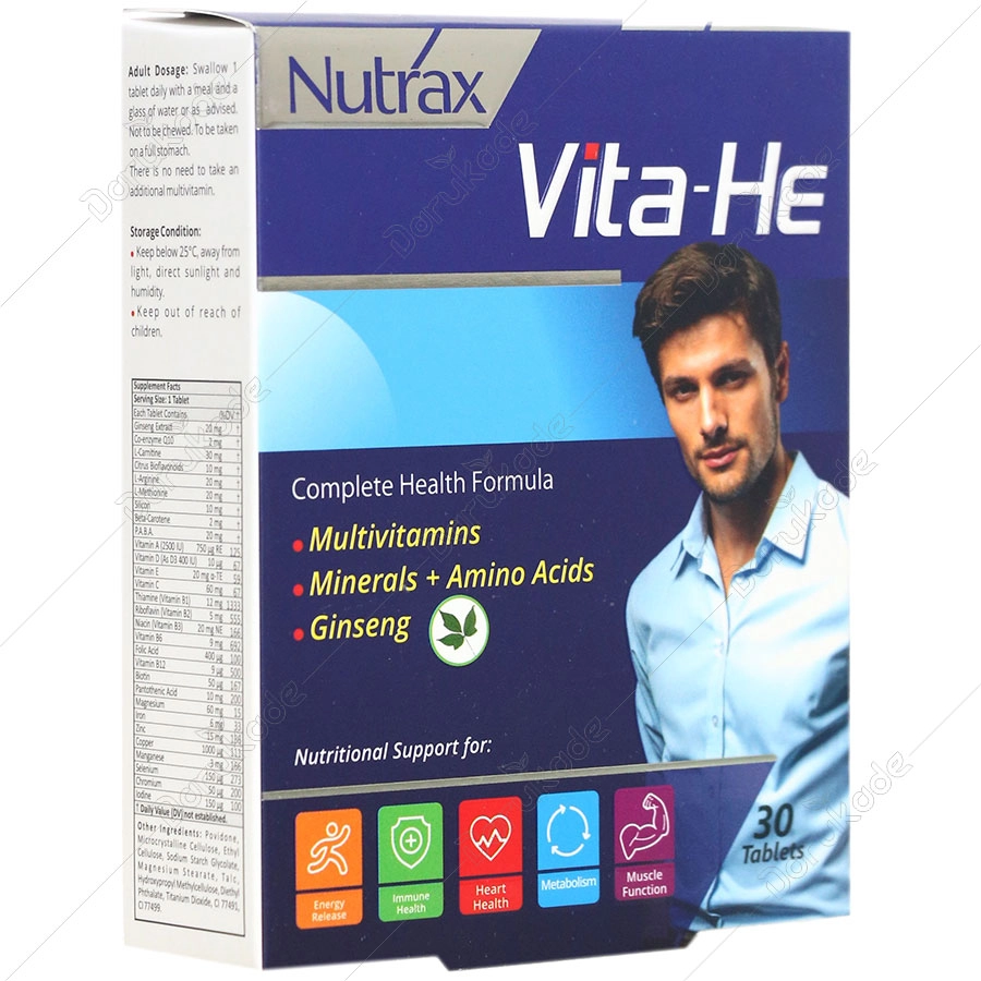 مولتی ویتامین و مینرال مخصوص آقایان، نوتراکس وایتا- هی از ویتامین ها، مواد معدنی و اسیدهای آمینه تهیه شده است که معمولا در مواد غذایی نیز یافت می شود. این فرآورده همچنین حاوی عصاره جینسنگ می باشد که به منظور افزایش انرژی و قوای جسمانی آقایان مورد استفاده قرار می گیرد.
