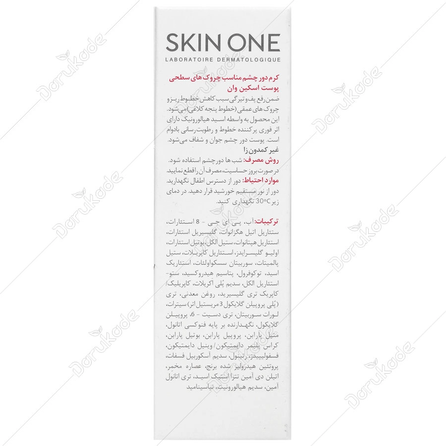 کرم دور چشم مناسب چروک های سطحی پوست اسکین وان ضمن رفع پف و تیرگی سبب کاهش خطوط ریز و چروک های عمقی (خطوط پنجه کلاغی) می شود. این محصول به واسطه اسید هیالورونیک دارای اثر فوری پر کننده خطوط و رطوبت رسانی بادوام است. پوست دور چشم جوان و شفاف می شود.