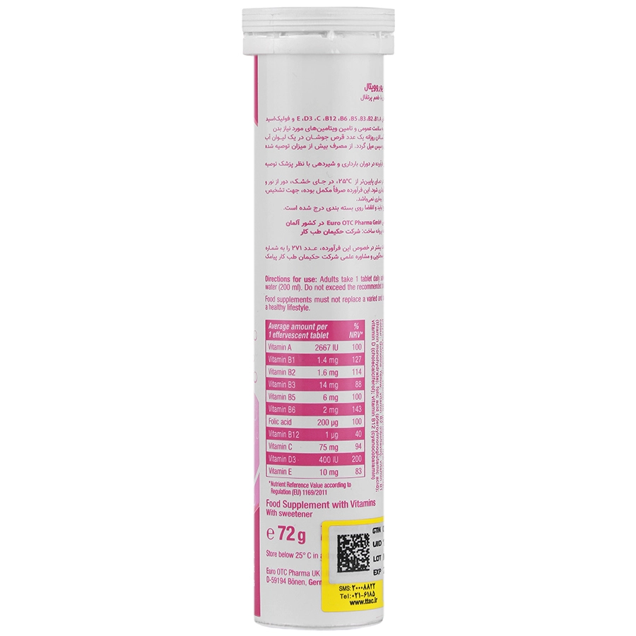 حاوی ویتامین های E ،D3 ،C ،B12 ،B6 ،B5 ،B3 ،B2 ،B1 ،A و فولیک اسید