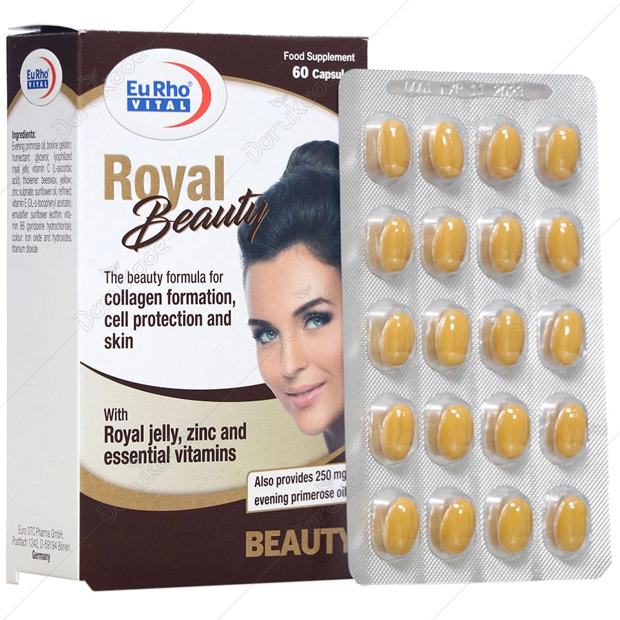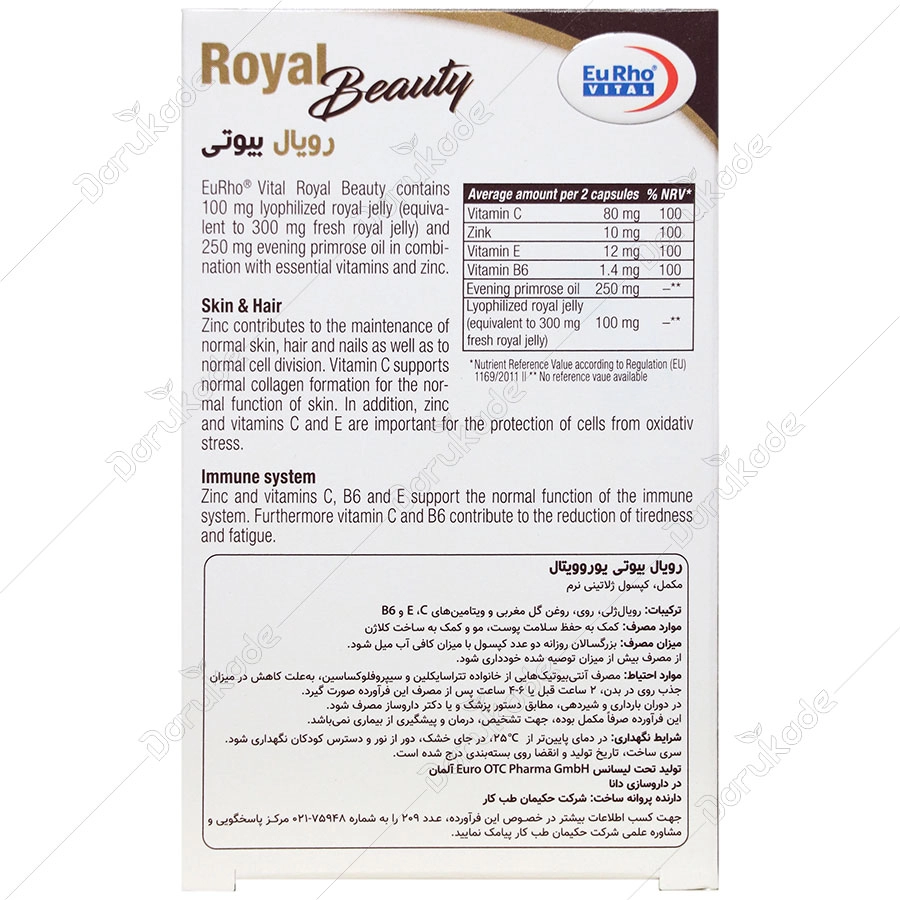 رویال بیوتی یوروویتال حاوی 100 میلی گرم ژل رویال لیوفیلیزه شده (معادل 300 میلی گرم ژل رویال تازه) و 250 میلی گرم روغن گل مغربی ترکیب شده با ویتامین های ضروری و روی است.