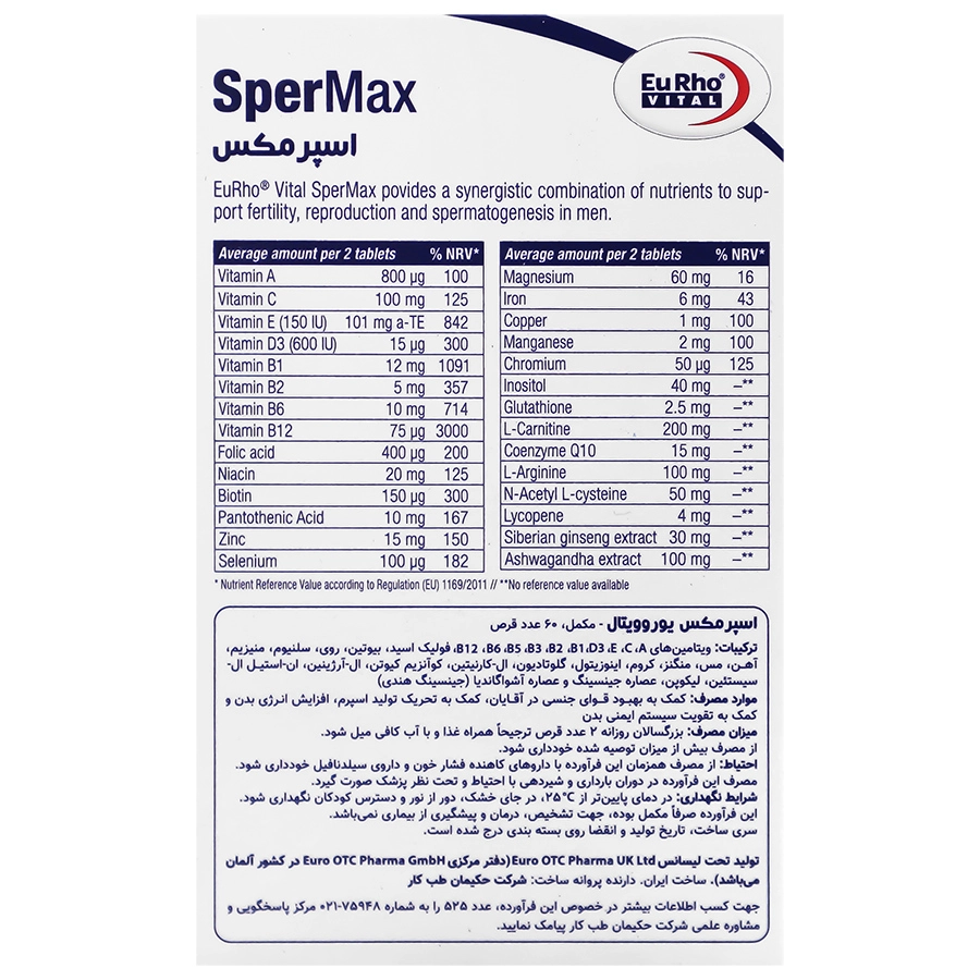 کمبود ریز مغذیها یکی از عوامل اصلی ناباروری در آقایان است، چرا که اسپرمها برای تامین انرژی کافی و محافظت در برابر آسیبهای محیطی نیازمند ویتامینها، مواد معدنی و ترکیبات آنتیاکسیدانی هستند. قرص اسپرمکس یوروویتال یک مکمل کامل و مناسب برای افزایش تعداد و بهبود کیفیت اسپرمها و افزایش قدرت باروری در آقایان میباشد.