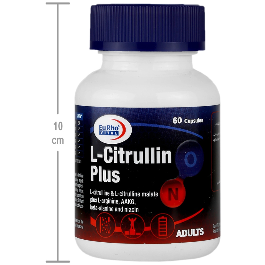 کپسول ال-سیترولین پلاس یوروویتال حاوی ال-سیترولین مالات، ال-سیترولین هیدروکلراید، ال-آرژینین، ال-آرژینین آلفا-کتوگلوتارات، بتا آلانین و نیاسین است که به افزایش حجم عضلانی، ارتقای عملکرد ورزشی، بهبود ریکاوری عضلات، کاهش احساس خستگی و افزایش قدرت بدنی کمک میکند.