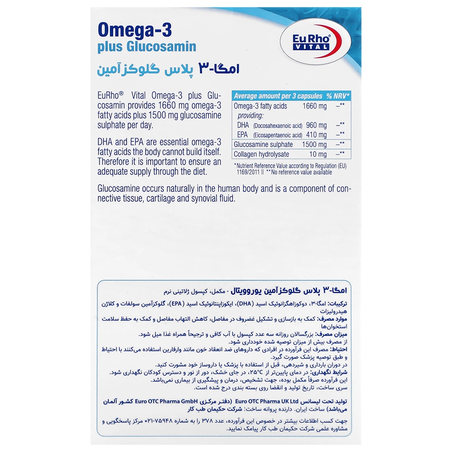 کپسول ژلاتینی نرم امگا-3 پلاس گلوکزآمین یوروویتال حاوی اسیدهای چرب امگا-3 (EPA و DHA)، گلوکزآمین سولفات و کلاژن هیدرولیزات، مکملی مناسب جهت حفظ سلامت مفاصل و غضروفها است که به پیشگیری و درمان آسیبهای مفصلی در بیماران مبتلا و مستعد ابتلا به آتروز و ورزشکاران آسیب دیده کمک میکند.