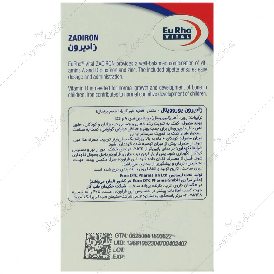 قطره زادیرون یوروویتال تامین کننده ترکیبی کامل از ویتامین های A و D به علاوه آهن و روی می باشد. این فرآورده حاوی آهن با ملح پیروفسفات و روی با ملح گلوکونات می باشد.