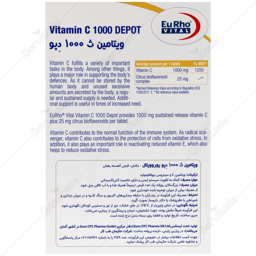 ویتامین C 1000 دپو یوروویتال تامین کننده ویتامین C به میزان 1000 میلی گرم به علاوه 25 میلی گرم سیتروس بیوفلاونوئید در هر قرص می باشد.