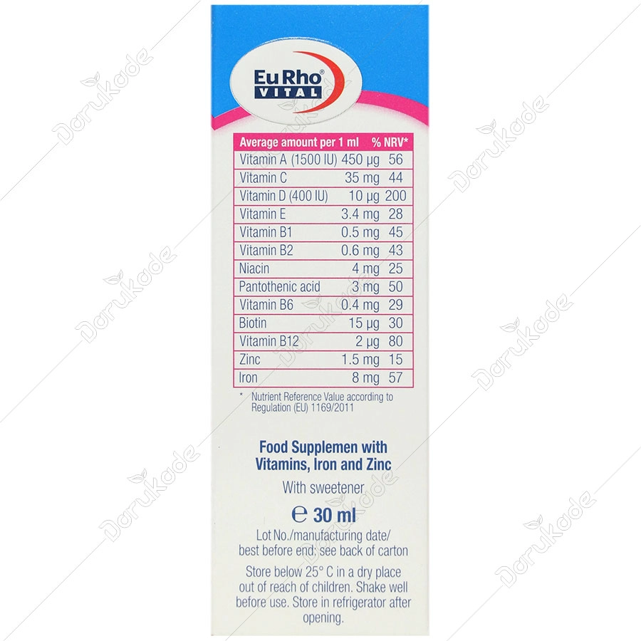 مکمل قطره خوراکی حاوی 11 نوع ویتامین به علاوه آهن و روی دارای حاوی ویتامین B12 ,B6 ,B2 ,B1 ,E ,D ,C ,A زینک، آهن، نیاسین، بیوتین و پانتوتنیک اسید