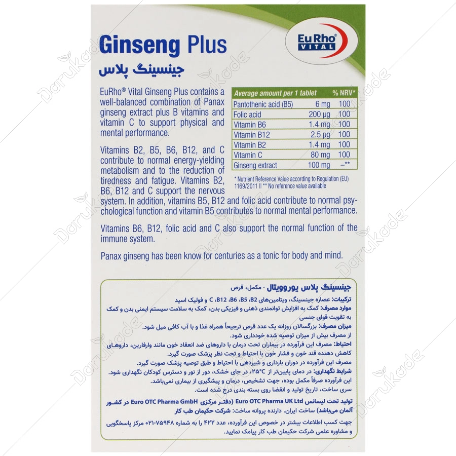 جینسینگ پلاس یوروویتال حاوی ترکیبی متعادل از عصاره جینسینگ به علاوه ویتامین های گروه B و ویتامین C جهت تقویت عملکرد فیزیکی و ذهنی بدن میباشد
