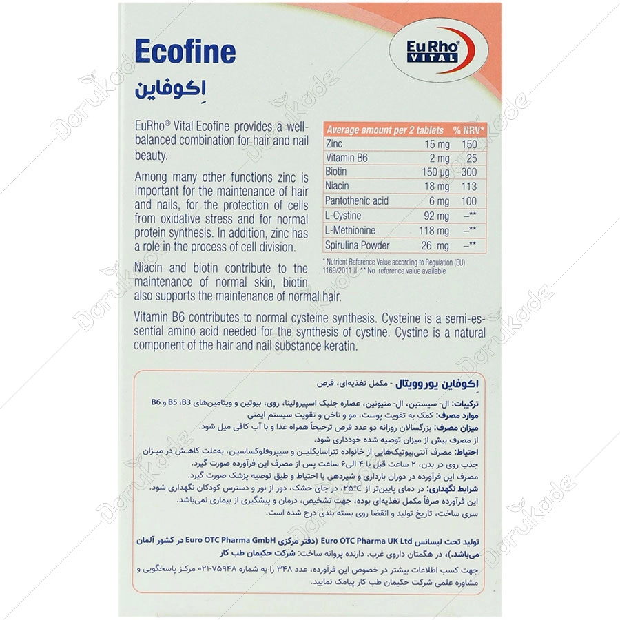 اکوفاین یوروویتال تامین کننده ترکیبی کامل و متعادل از مواد لازم جهت حفظ سلامت و زیبایی مو و پوست می باشد. روی دارای تاثیرات مفید گوناگون در بدن است، از جمله دارای نقش مهمی در حفظ سلامت مو و ناخن ها می باشد و جهت حفظ سلول ها در برابر استرس اکسیداتیو و سنتز پروتئین مورد نیاز می باشد و دیگر آنکه در روند تقسیم سلولی حائز اهمیت می باشد. نیاسین و بیوتین در حفظ سلامت پوست و بیوتین در حفظ موهای طبیعی نقش دارد. ویتامین B6 در سنتز طبیعی سیستئین موثر است. سیستئین یک نوع اسید آمینه نیمه ضروری در بدن است که در سنتز سیستین نقش دارد. سیستین یکی از اجزای طبیعی تشکیل دهنده ساختار مو و کراتین ناخن می باشد. سیستئین و متیونین، دو اسید آمینه می باشند که از اجزای تشکیل دهنده مو و کراتین بوده و در حفظ سلامت و ترمیم آن نقش دارند. اسپیرولینا که نام علمی آن Arthrospira می باشد گونه ای از سیانو باکتری ها است که به جلبک سبز-آبی نیز معروف می باشد. اسپیرولینا غنی از پروتئین، اسیدهای آمینه و ویتامین های گروه B می باشد.