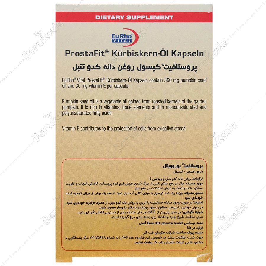 پروستافیت یوروویتال حاوی 360 میلی گرم روغن دانه کدو تنبل و 30 میلی گرم ویتامین E در هر کپسول می باشد.