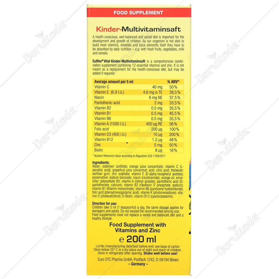 شربت کیندر حاوی روی، ویتامین های K، E، D3، C، B12، B6، B5، B3، B2، B1، A، اسید فولیک و بیوتین