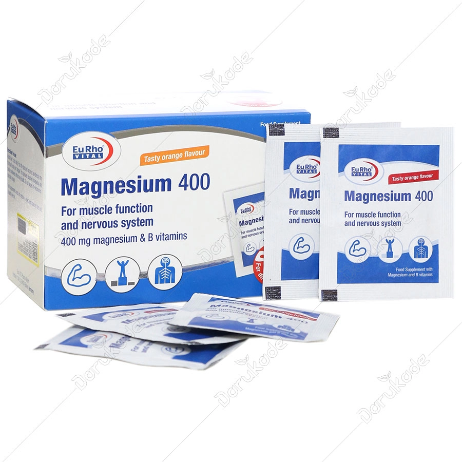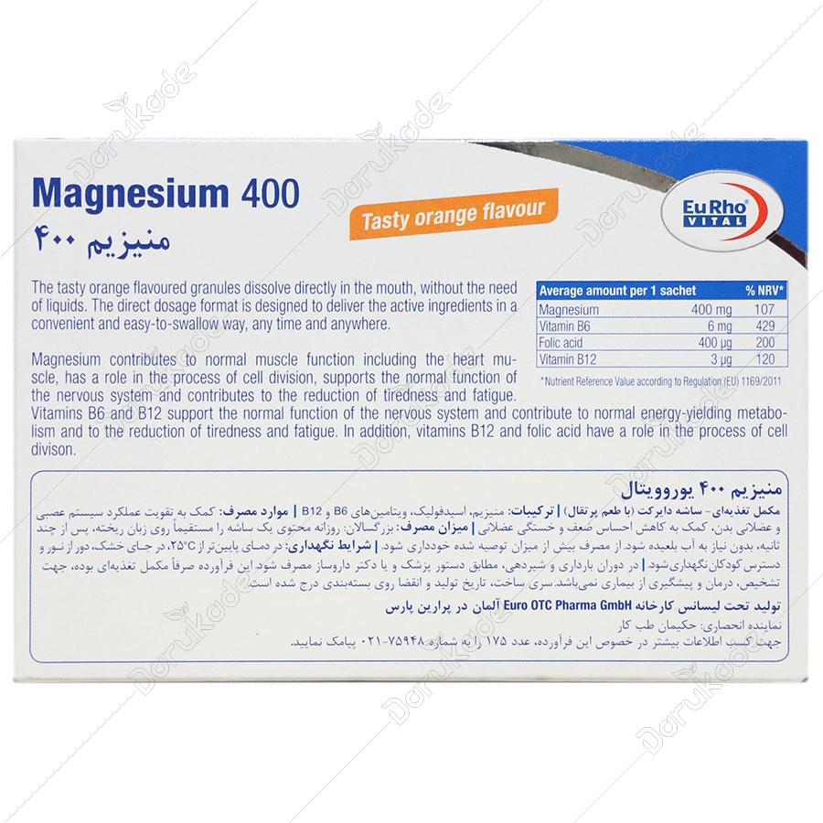 منیزیم 400 یوروویتال مواد مغذی مهمی را تامین می کند منیزیم یک ماده معدنی ضروری است که بدن قادر به تولید آن نمی باشد. علاوه بر این، ذخیره سازی منیزیم در بدن فقط به میزان محدودی امکان پذیر می باشد. منیزیم به متابولیسم انرژی طبیعی و عملکرد طبیعی عضلات کمک می نماید. همچنین باعث تقویت عملکرد سیستم عصبی می گردد.