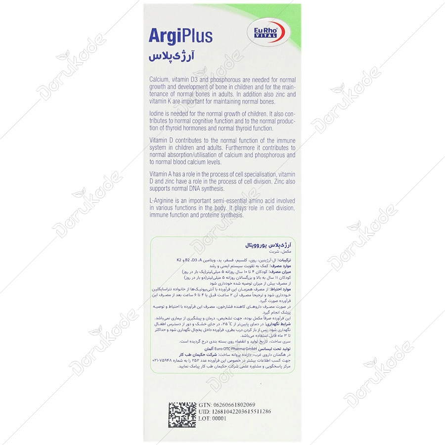 شربت آرژی پلاس حاوی ال-آرژنین، روی، کلسیم، فسفر، ید، ویتامین B2، D3، A و K2