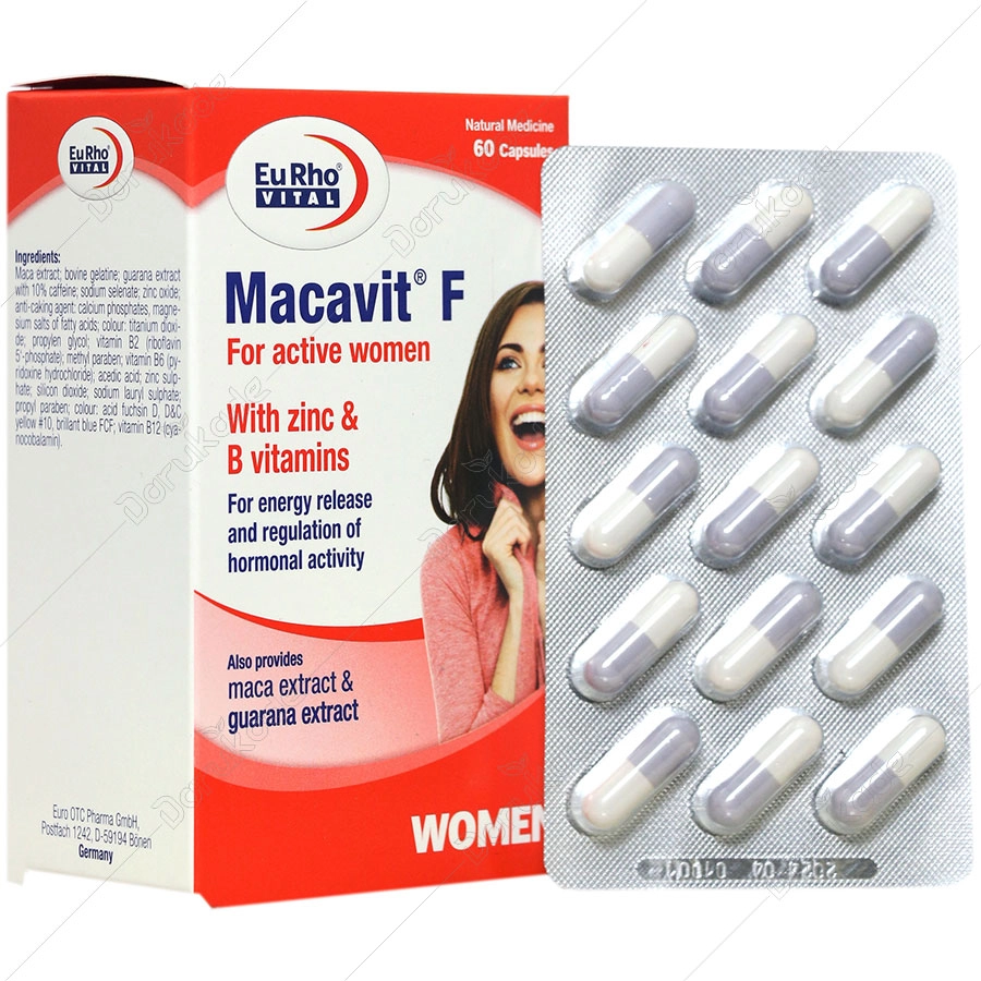 ماکاویت F یوروویتال حاوی عصاره گیاه ماکا، عصاره گوارانا، سلنیوم، روی و ویتامین های گروه B می باشد که یک ترکیبی متعادل از مواد مغذی برای خانم ها می شود.