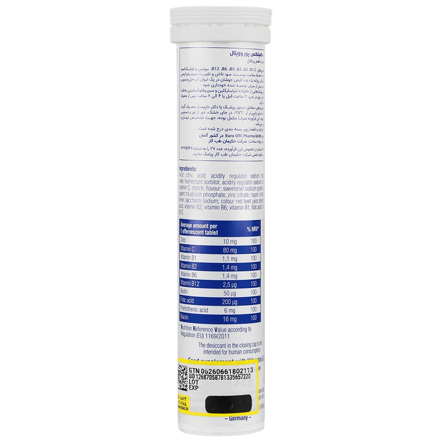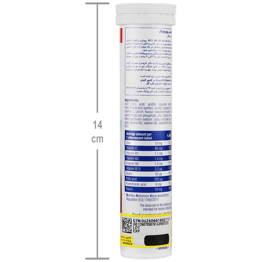 حاوی ویتامین های B1 ،B2 ،B3 ،B5 ،B6 ،B12، ویتامین سی، روی، بیوتین، فولیک اسید، پانتتونیک اسید و نیاسین