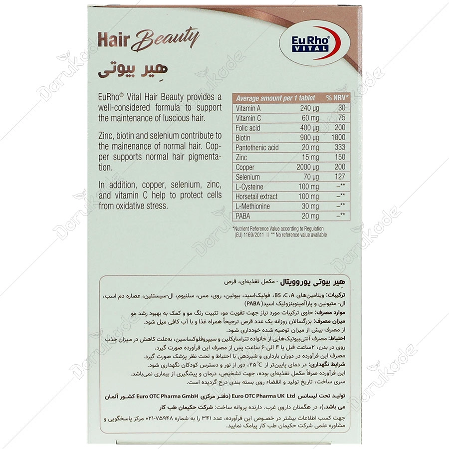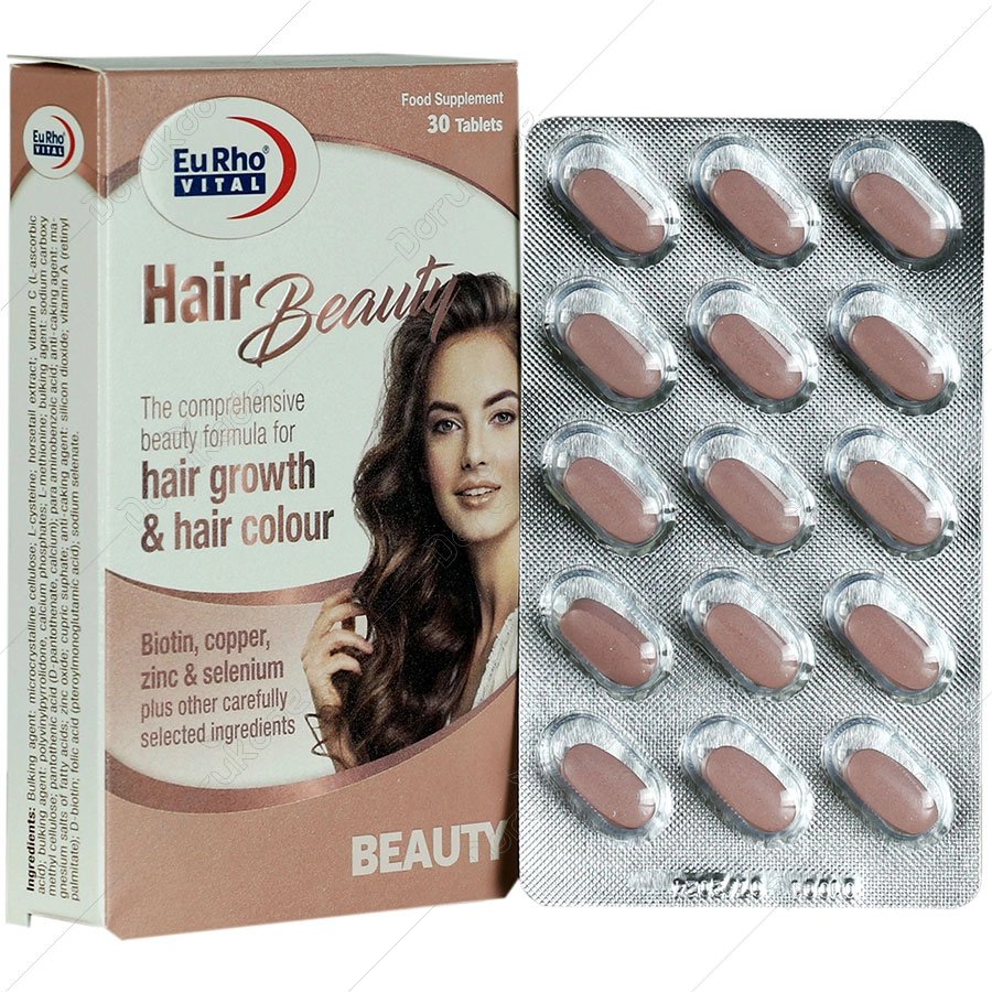 مجموعه ای از آمینو اسیدهای سولفور دار، ویتامین ها و مواد معدنی جهت رشد مو، تقویت ناخن و حفظ سلامت پوست ضروری است. کمبود این ریز مغذی ها باعث آسیب، ریزش و تغییر در بافت و رنگ مو می شود. قرص هیر بیوتی یورو ویتال حاوی آمینو اسید های ال-سیستئین و ال-متیونین، عصاره گیاه دم اسبی، پابا، ویتامینها و مواد معدنی مورد نیاز برای تقویت مو است.