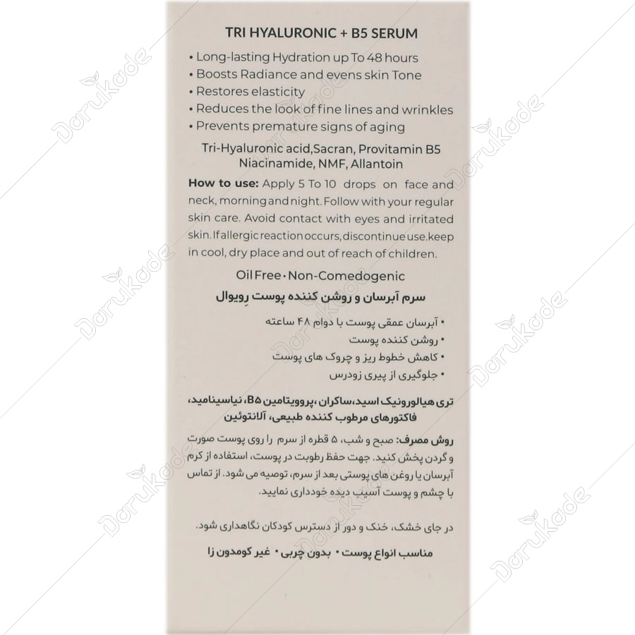 حاوی تری هیالورونیک اسید، ساکران، پروویتامین B5، نیاسینامید، فاکتورهای مرطوب کننده طبیعی، آلانتوئین