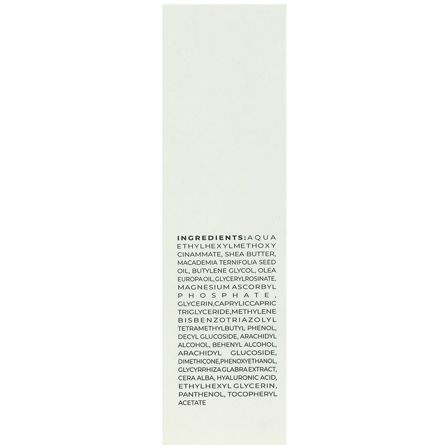حاوی ویتامین C پایدار، عصاره شیرین بیان، فیلترهای جاذب یووی، اسید هیالورونیک، شی باتر، روغن ماکادمیا، پروویتامین B5، ویتامین E