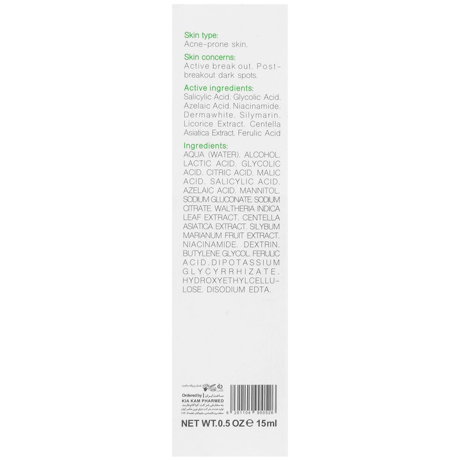 فرمولاسیونی قوی با اثربخشی سریع برای پیشگیری و بهبود موضعی آکنه و لک های به جای مانده از آن است. علاوه بر 2% سالیسیلیک اسید این محصول حاوی هفت ترکیب موثر است که با اثرات اختصاصی ضد باکتری، ضد الهاب، رفع لک ناشی از آکنه و کنترل چربی پوست باعث بهبود جوش و لک ناشی از آن می شود.