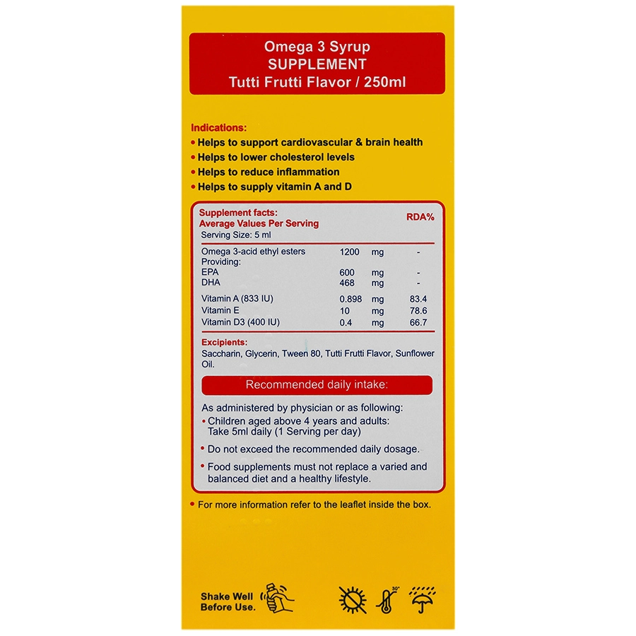 فرمولاسیون این محصول شامل امگا 3، ویتامین های D ،A و E می باشد. اسیدهای چرب امگا 3 گروهی از اسیدهای چرب غیر اشباع چندگانه هستند و دارای نقش مهمی در حفظ ساختار سلول و عملکردهای مهم بدن می باشند.