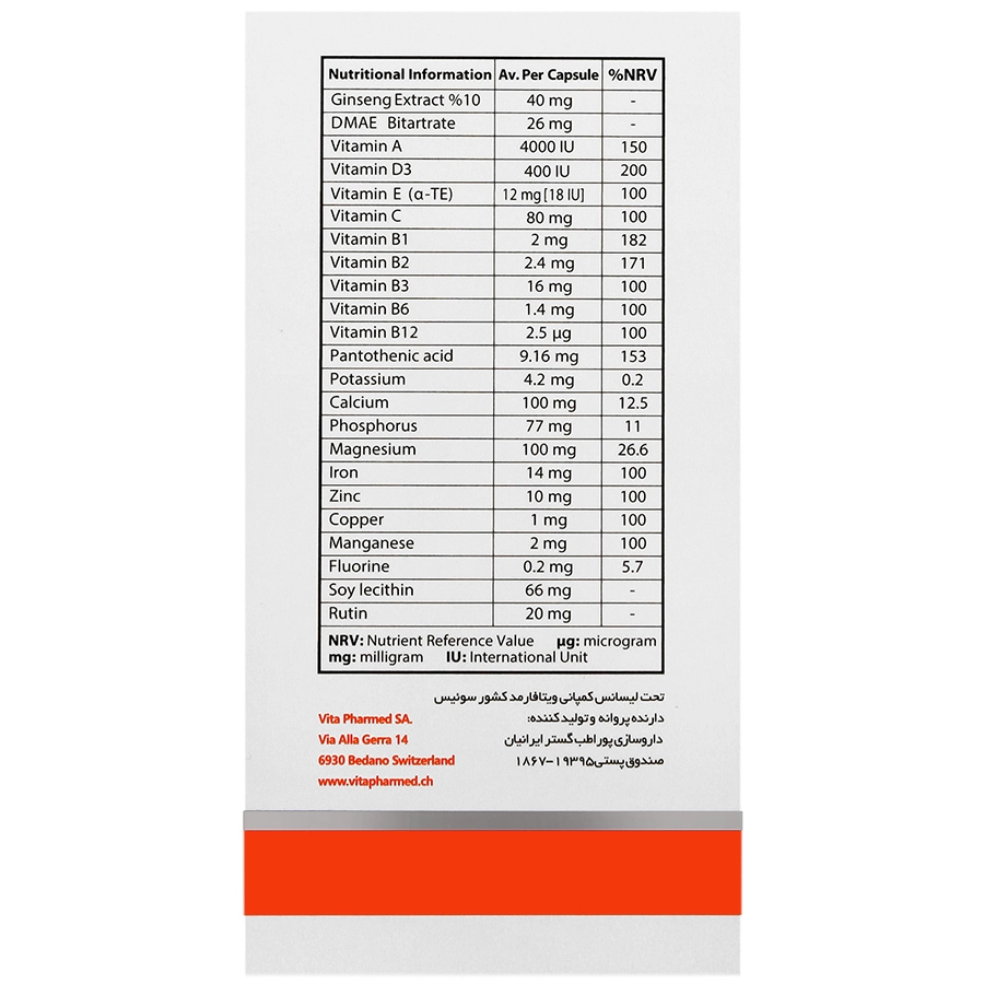 • مکمل غذایی مولتی‌ویتامین-مینرال حاوی ویتامین‌ها، مواد معدنی، جینسینگ، لسیتین سویا و روتین