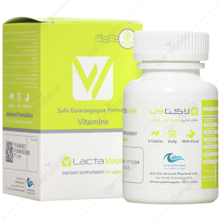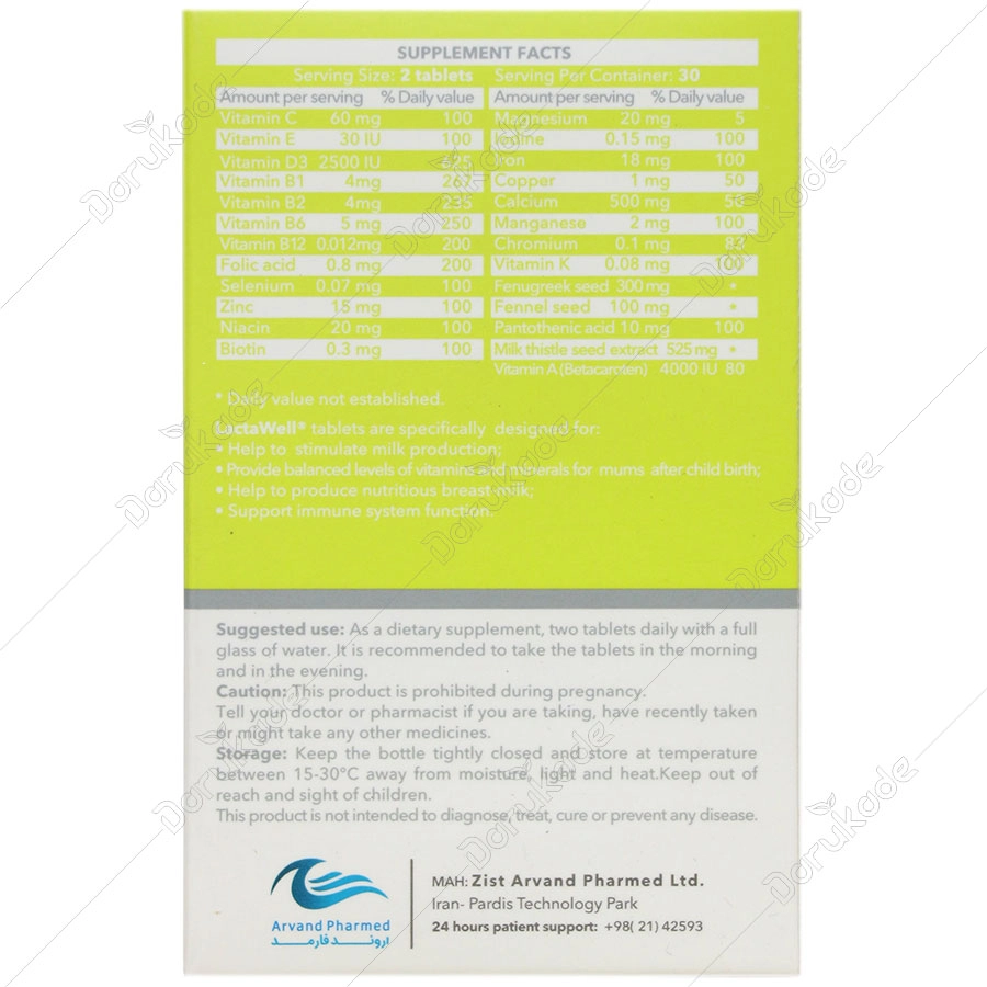 زیست اروند فارمدقرص شیرافزا لاکتاول حاوی ویتامین های مختلف (B12 ،B6 ،E ،C ،B1 ،A ،D3 و فولیک اسید) و مواد معدنی مانند (کلسیم، منیزیم، سلنیوم و روی)