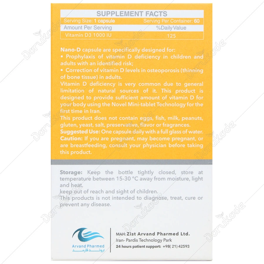 کپسول نانو-دی حاوی ویتامین D3 می باشد که جهت تنظیم جذب و متابولیسم کلسیم و استقرار آن در داخل بافت استخوانی استفاده می شود. ویتامین D جهت جذب کلسیم از لوله گوارش و عملکرد کلسیم در بدن اهمیت دارد. به علاوه جهت پیشگیری از مشکلات ناشی از کمبود ویتامین D، به ویژه در پوست و استخوان مصرف می شود. ویتامین D ممکن است در موارد دیگری که در این راهنما به آن اشاره نشده است، نیز استفاده شود.