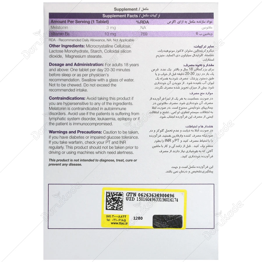 هشدارها و احتیاطات: در مصرف همزمان این محصول و وارفارین INR,PT بطور منظم اندازه گیری شود. در صورت ابتلا به دیابت یا عدم تحمل گلوکز، با احتیاط مصرف شود زیرا ملاتونین ممکن است باعث افزایش سطح قند خون شود. بروز خواب آلودگی و کاهش سطح هوشیاری ممکن است تا چندین ساعت پس از مصرف ملاتونین ادامه یابد . بنابراین از مصرف این فرآورده قبل از رانندگی و استفاده از ماشین آلات خودداری شود. قبل از مصرف با پزشک مشورت نمایید.