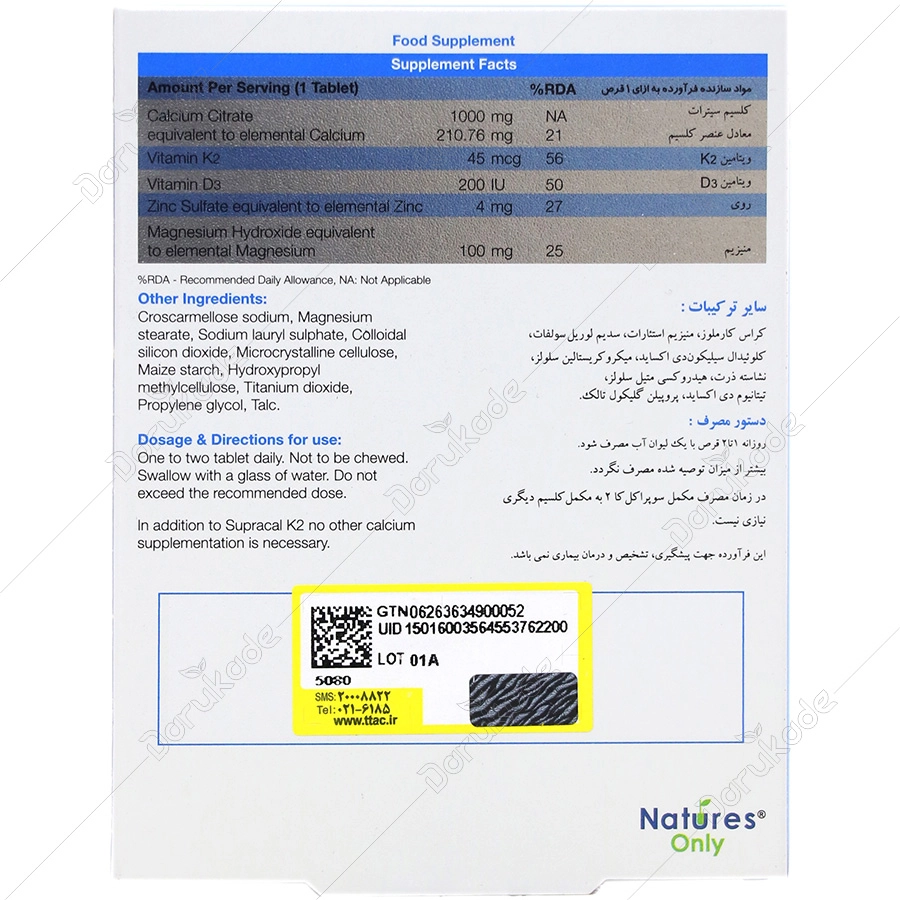 بیشتر از مقدار توصیه شده مصرف نگردد. در زمان مصرفسوپراکل کا2 به مکمل کلسیم دیگری نیازی نیست. این فرآورده جهت پیشگیری، تشخیص و درمان بیماری نمی باشد.