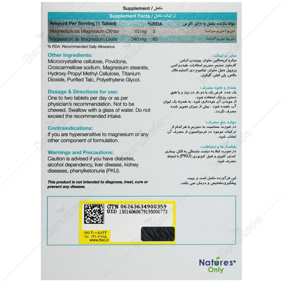هر قرص شامل منیزیم سیترات معادل 10 میلی گرم، منیزیم اکساید معادل 340 میلی گرم یون منیزیم