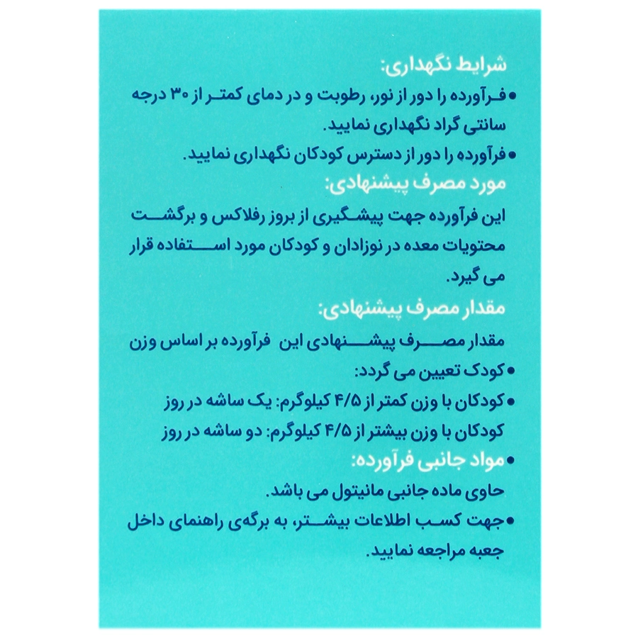 موارد منع مصرف: در صورت وجود موارد زیر، قبل از مصرف دارو با پزشک یا داروساز خود مشورت نمایید. در صورت وجود هرگونه حساسیت نسبت به سدیم آلرژینات و منیزیم آلرژینات یا هر کدام از اجزای فراورده نوزادان نارس انسداد روده در صورت وجود تب، استفراغ و یا اسهال در کودک در کودکان مشکوک و یا مبتلا به مشکلات کلیوی و یا دارای رژیم غذایی کم نمک