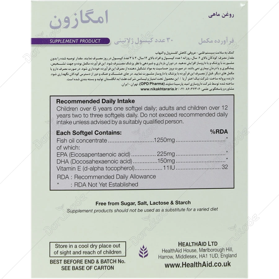 کپسول امگازون تحت امتیاز و لیسانس شرکت هلث اید انگلستان، ساخته شده توسط شرکت داروسازی امید پارسینا دماوند و دارنده پروانه ساخت شرکت نیک اختر آریا می باشد.