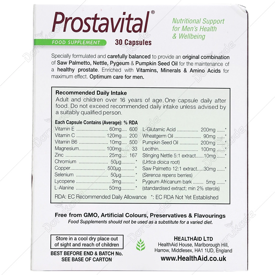 - سرطان پروستات کپسول Prostavital کمپانی Health Aid ترکیبی است کاملاً طبیعی و ویژه شامل انواع ویتامین ها، مواد معدنی، اسید آمینه های ضروری و ترکیبات گیاهی که جهت حفظ سلامت و بهبود عملکرد پروستات و پیشگیری ازابتلا به اختلالات پروستات فرموله شده است.