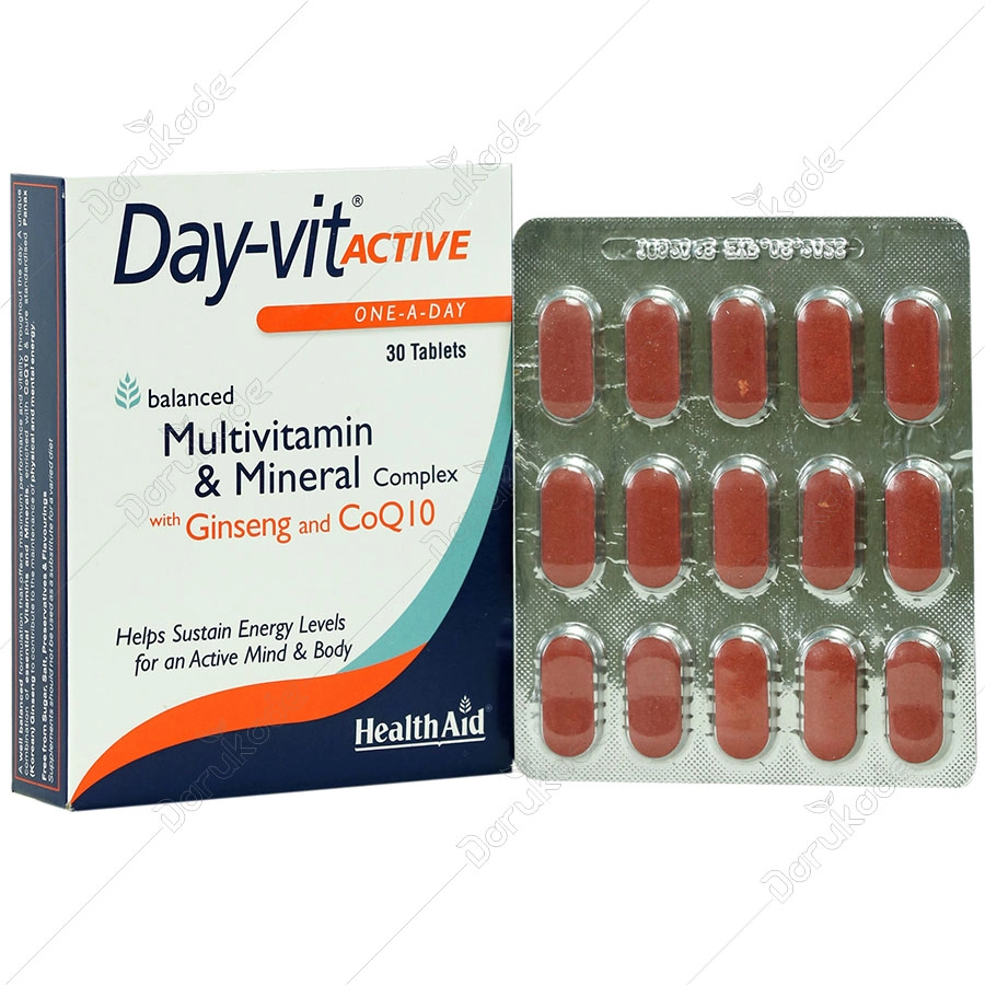 قرص Day Vit Active کمپانی Health Aid، ترکیب متعادلی از ویتامین ها، مواد معدنی، اسیدهای آمینه، کوآنزیم Q10 و جینسینگ است، که برای بهبود و حفظ سلامتی و شادابی بدن فرموله شده است. این ترکیب ویژه تأمین کننده 100% نیاز روزانه به ویتامین های A ،D ،C ،E ،K و ویتامین های گروه B می باشد، علاوه برآن حاوی مواد معدنی مورد نیاز برای سلامت بدن شامل: روی، آهن، سلنیم، کلسیم، کلر، پتاسیم، فسفر، منیزیم، ید، منگنز، مس، کروم و مولیبدنیوم بوده و همچنین اسید آمینه متیونین و ترکیبات ویژه دیگر نظیر: کولین، اینوزیتول، لوتئین، سیلیکا، کوآنزیم Q10 و جینسینگ برای اثربخشی بیشتر و بهتر به آن افزوده شده اند.