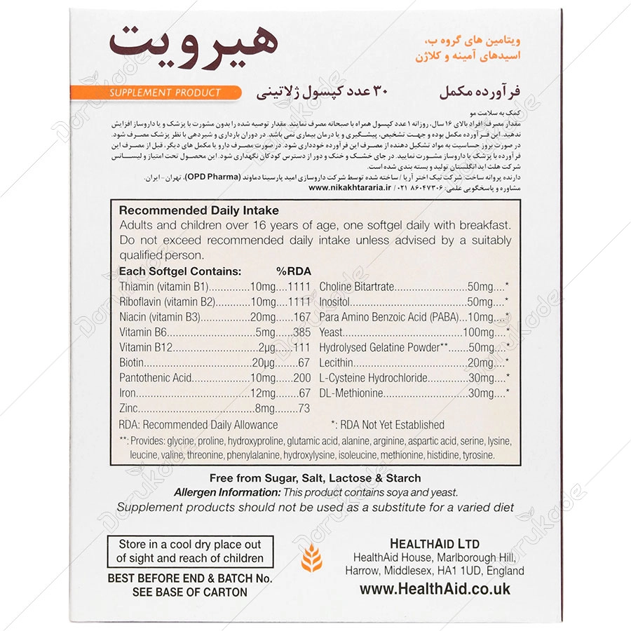 کپسول hair vit کمپانی Health Aid حاوی مجموعه ای از ویتامین های گروه B و اسیدهای آمینه ضروری می باشد. مصرف قرص ریزش مو هیرویت باعث جلوگیری از ریزش مو، بهبود بافت و افزایش ضخامت مو شده و همچنین سبب بهبود رنگ و درخشندگی مو نیز می شود و در تأمین سلامت مو بسیار مؤثر عمل می کند.