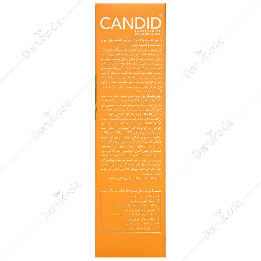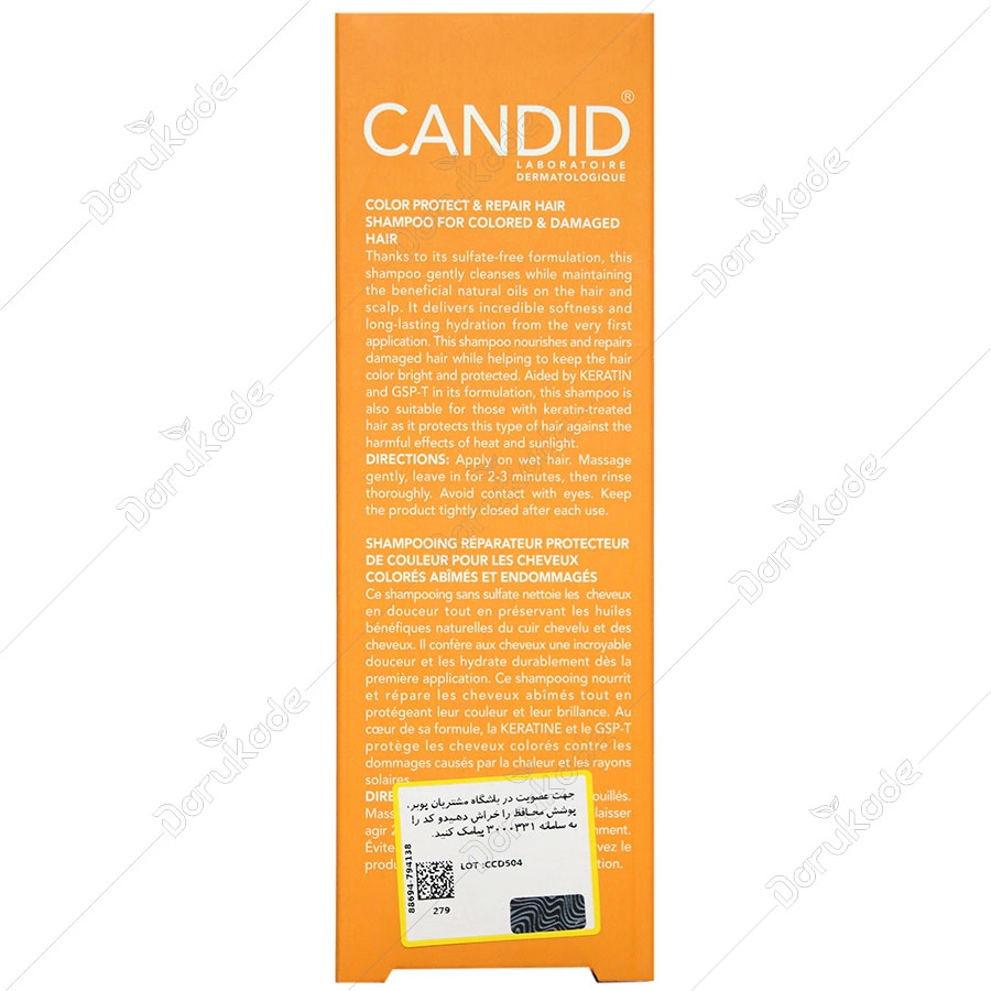 شامپو تثبیت رنگ و ترمیم مو کاندید برای موی رنگ شده و آسیب دیده: این شامپو به دلیل فرمولاسیون فاقد سولفات، ضمن پاک کردن موها به ملایمت، چربی های مفید طبیعی پوست سر مو را حفظ می کند. از همان بار اول مصرف، سبب آبرسانی بادوام ، نرمی و لطافت قابل توجه مو می شود. این شامپو ضمن کمک به حفظ درخشندگی و رنگ مو، مغذی و ترمیم کننده موی آسیب دیده است. به واسطه کراتین و جی اس پی-تی در فرمولاسیون آن، برای افرادی که موهای کراتینه شده دارند، نیز مناسب است و از این نوع مو در برابر اثرات آسیب رسان، حرارت و نور آفتاب محافظت می نماید.