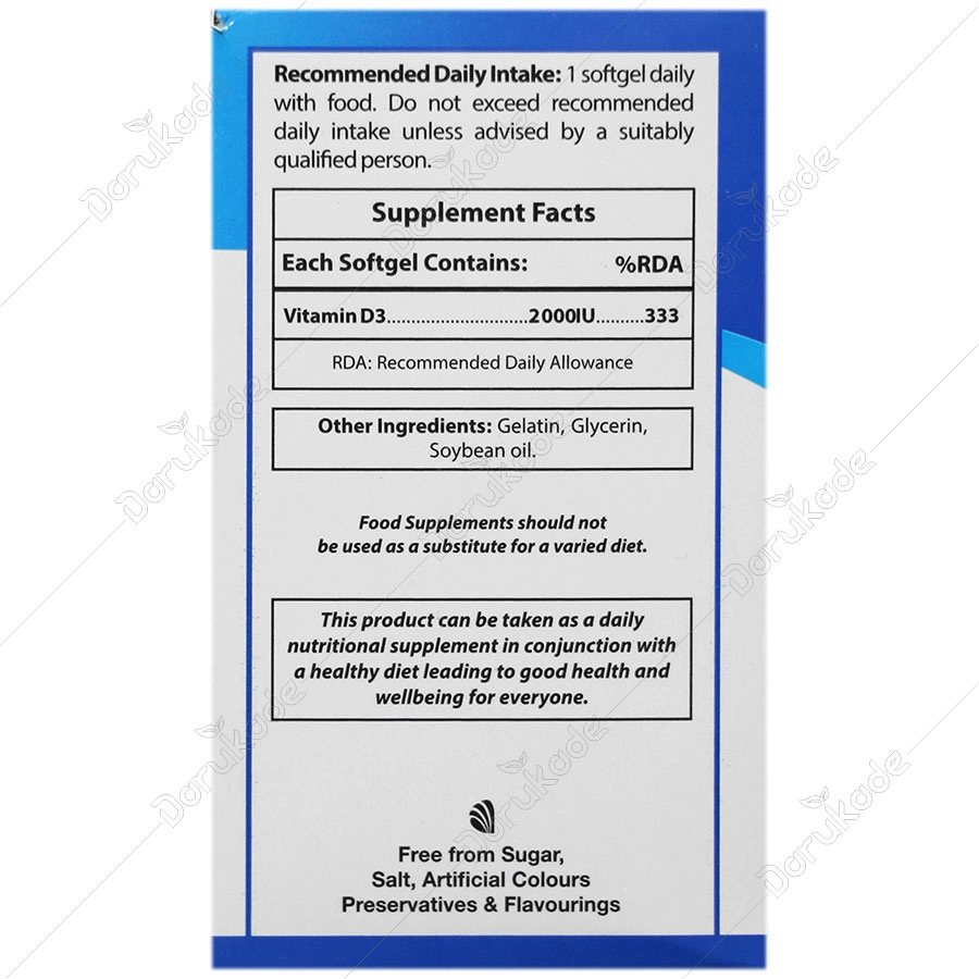 • حاوی دوز 2000 واحد بین‌المللی ویتامین دی ۳، بیشتر از نیاز روزانه توصیه شده اما ایمن